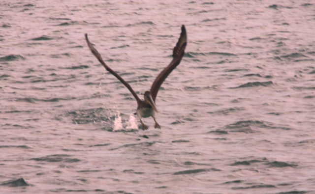 Startversuch des Pelikans mit viel Flügelschlag auf dem Wasser